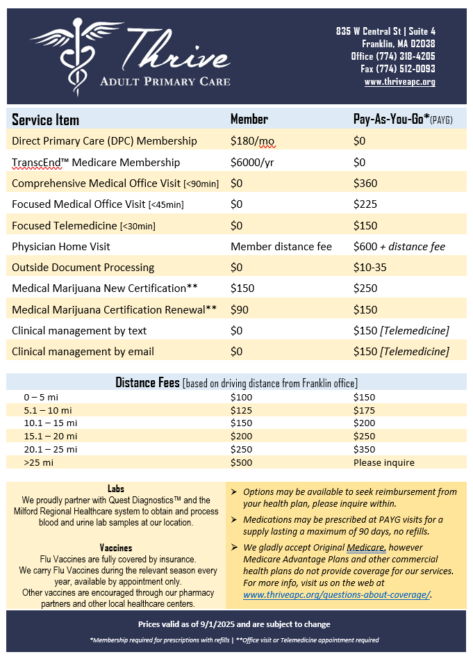 What this means for us at Thrive Adult Primary Care is that to stay solvent, we will only be able to offer the convenience of Telehealth encounters by charging out of pocket fees. Medicare patients who are not paying a concierge membership fee will only have coverage (through Medicare) for direct physician access in the setting of in-person encounters.